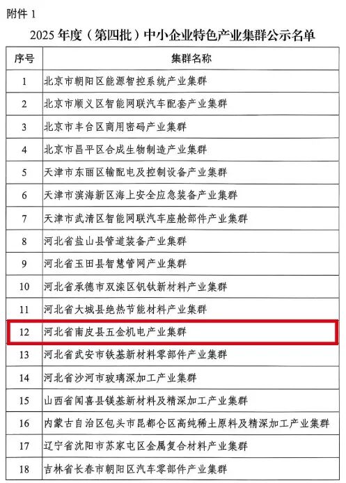 日前,工业和信息化部发布2025年度(第四批)中小企业特色产业集群名单,全省共7个中小企业特色产业集群入选,南皮县五金机电产业集群名列其中。