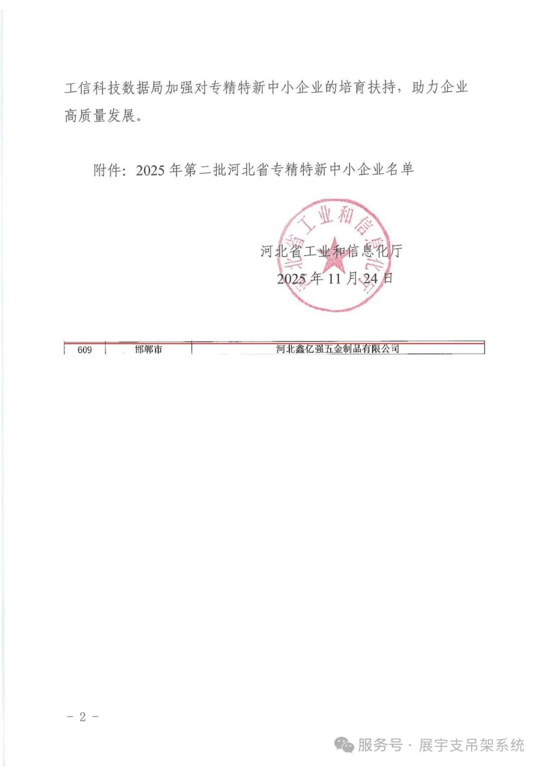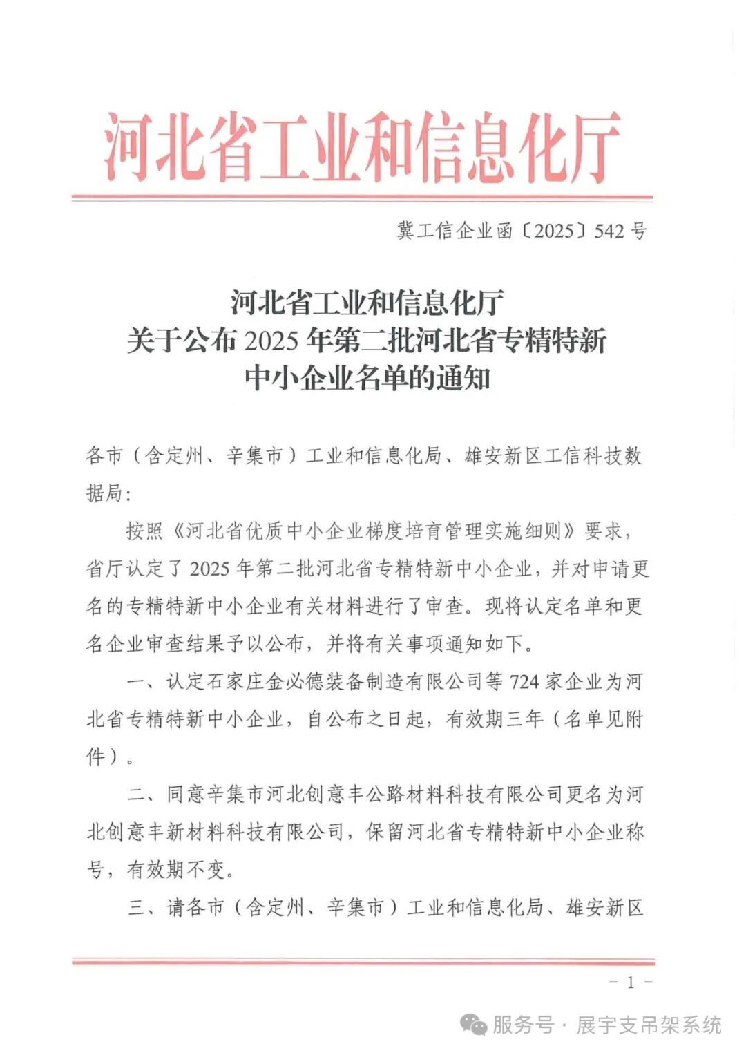 近日,河北省工业和信息化厅正式公布2025年第二批河北省专精特新中小企业名单,展宇实业集团有限公司旗下子公司——河北鑫亿强五金制品有限公司凭借在行业领域的深耕积淀、技术创新与市场竞争力,成功获评!
